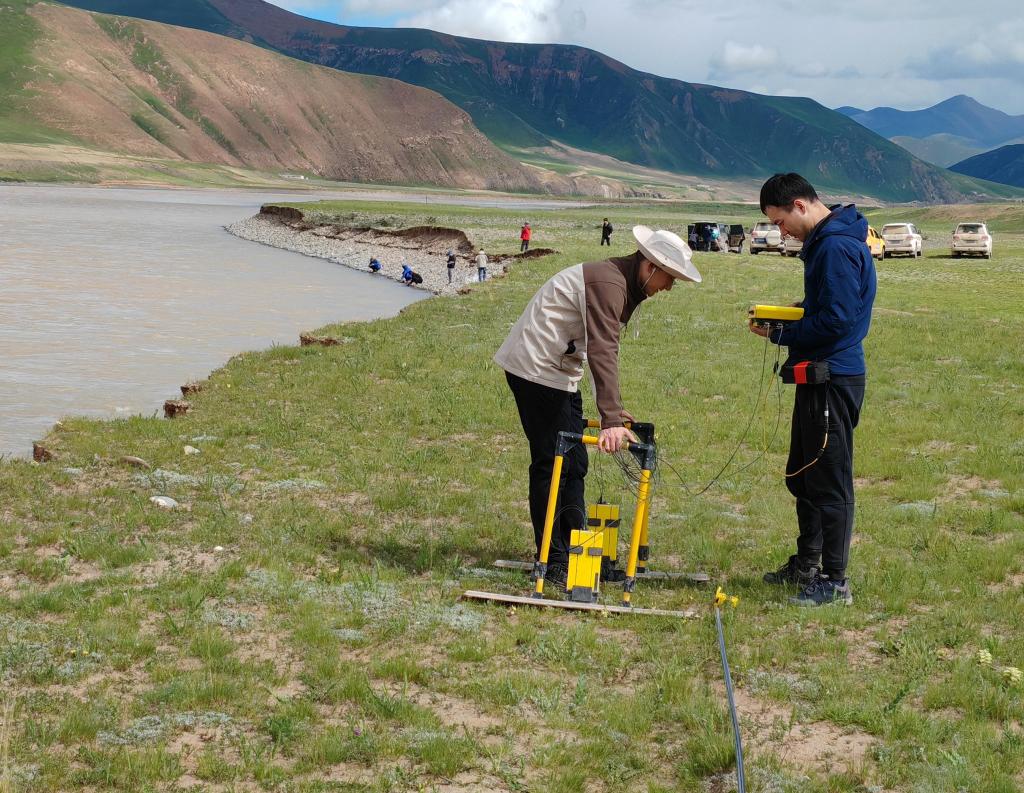 7月25日,范越(前左)和董士琦在長江上游干流通天河畔開展地質雷達探測。(受訪者供圖)