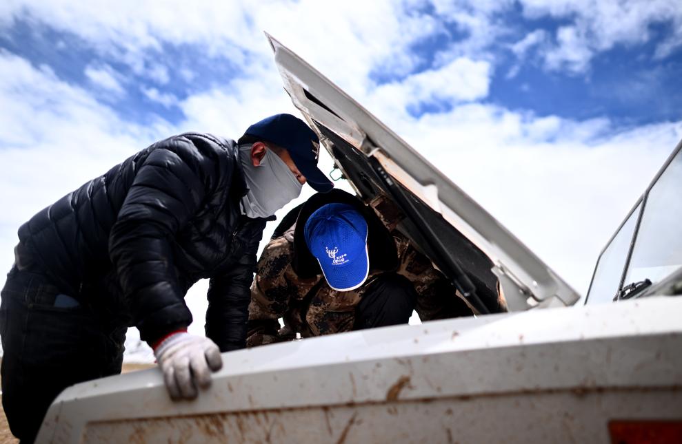 可可西里管理處卓乃湖保護站隊員在查看車輛受困狀況(6月16日攝)。新華社記者 張宏祥 攝