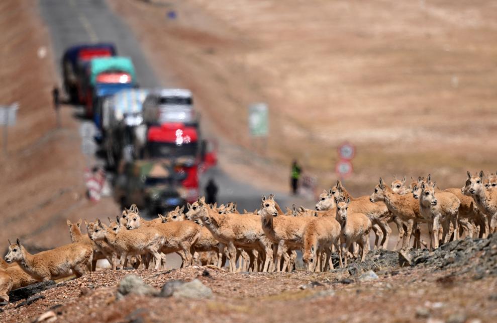 一群藏羚羊通過青藏公路前往青海三江源地區(qū)(7月28日攝)。新華社記者 張宏祥 攝