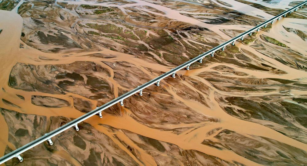 青藏鐵路列車通過辮狀河道的長江北源楚瑪爾河(7月29日攝,無人機(jī)照片)。新華社記者 劉詩平 攝