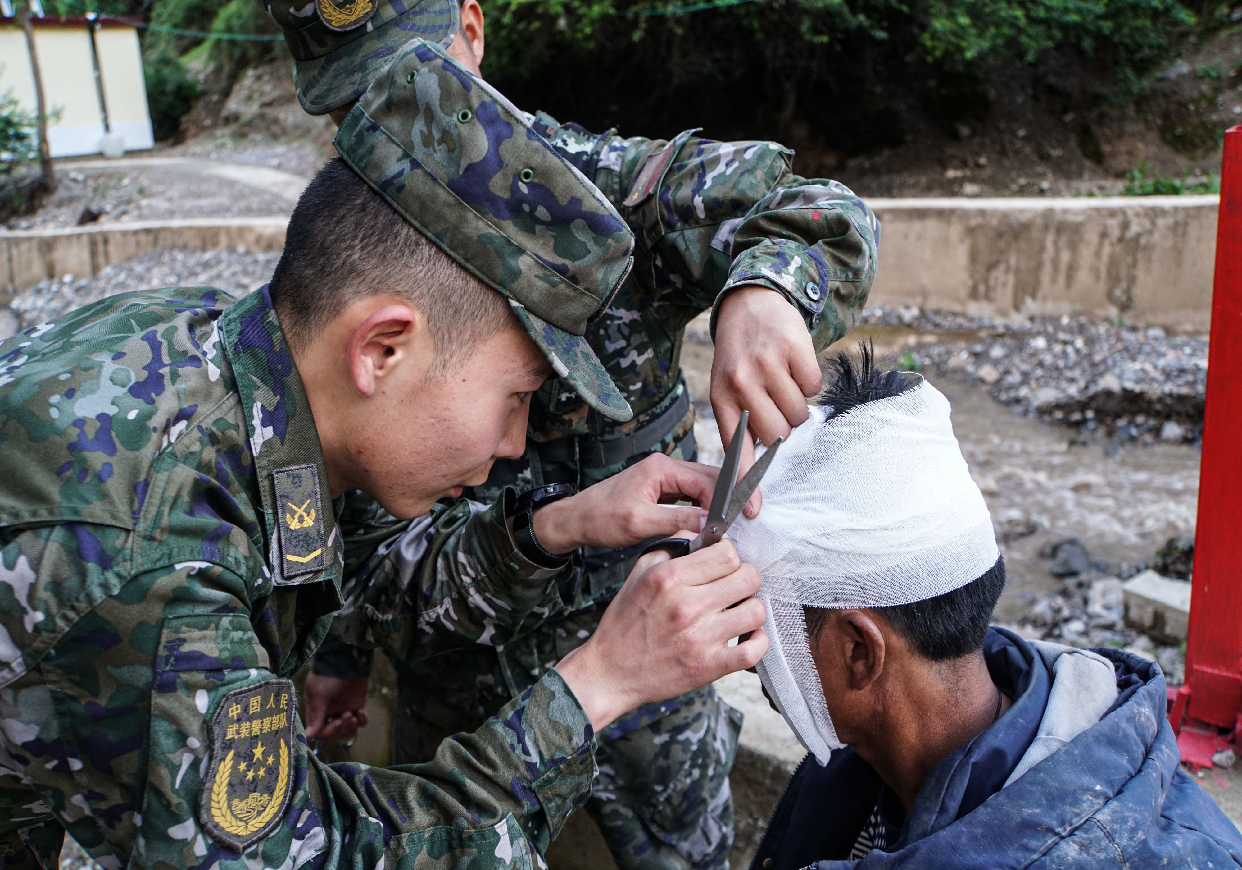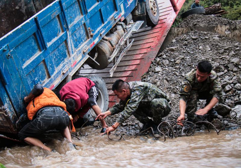 “同志,不要怕,我們是武警官兵,我們先給你處理傷口?!?甕云飛一邊安撫受傷群眾的情緒,一邊為他消毒止血、包扎傷口。后經(jīng)檢查,該群眾除了頭部有輕微皮外傷外,全身并無大礙。之后,中隊(duì)官兵又和當(dāng)?shù)厝罕娨黄鹜度胲囕v緊急救援,經(jīng)過幾個小時的努力,大家齊心協(xié)力將貨車拖至安全地帶。