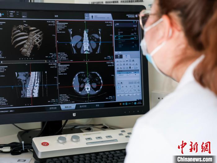在“移動(dòng)醫(yī)療一體車”內(nèi),26歲的才吉舉著雙手平躺,正等待著胸部CT掃描設(shè)備檢測(cè)。CT室外,放射科副主任扎西措熟練操作著按鍵,不一會(huì)兒,才吉的檢測(cè)影像就呈現(xiàn)在了電腦屏幕上。