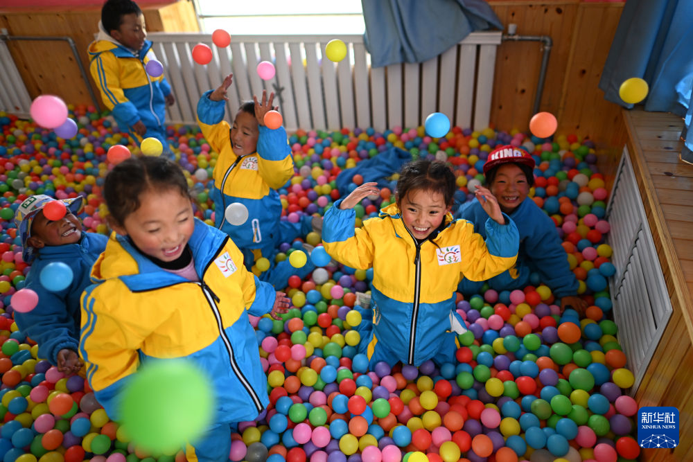 在曲麻萊縣秋智鄉(xiāng)幼兒園,昂文拉毛(右二)和伙伴們在教室內玩耍(9月13日攝)。新華社 張宏祥 攝
