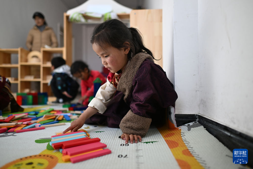 在曲麻萊縣麻多鄉(xiāng)幼兒園,索南拉吉(右一)在教室內搭積木(9月20日攝)。新華社 張宏祥 攝