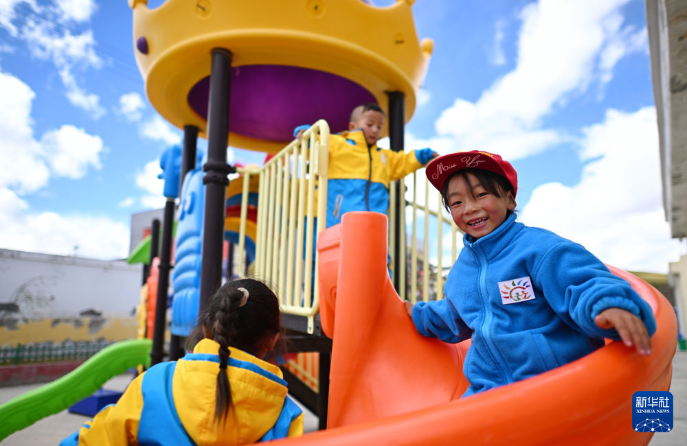 在曲麻萊縣秋智鄉(xiāng)幼兒園,仁青卓瑪(右)和伙伴們在校園內玩耍(9月13日攝)。新華社 韓方方 攝