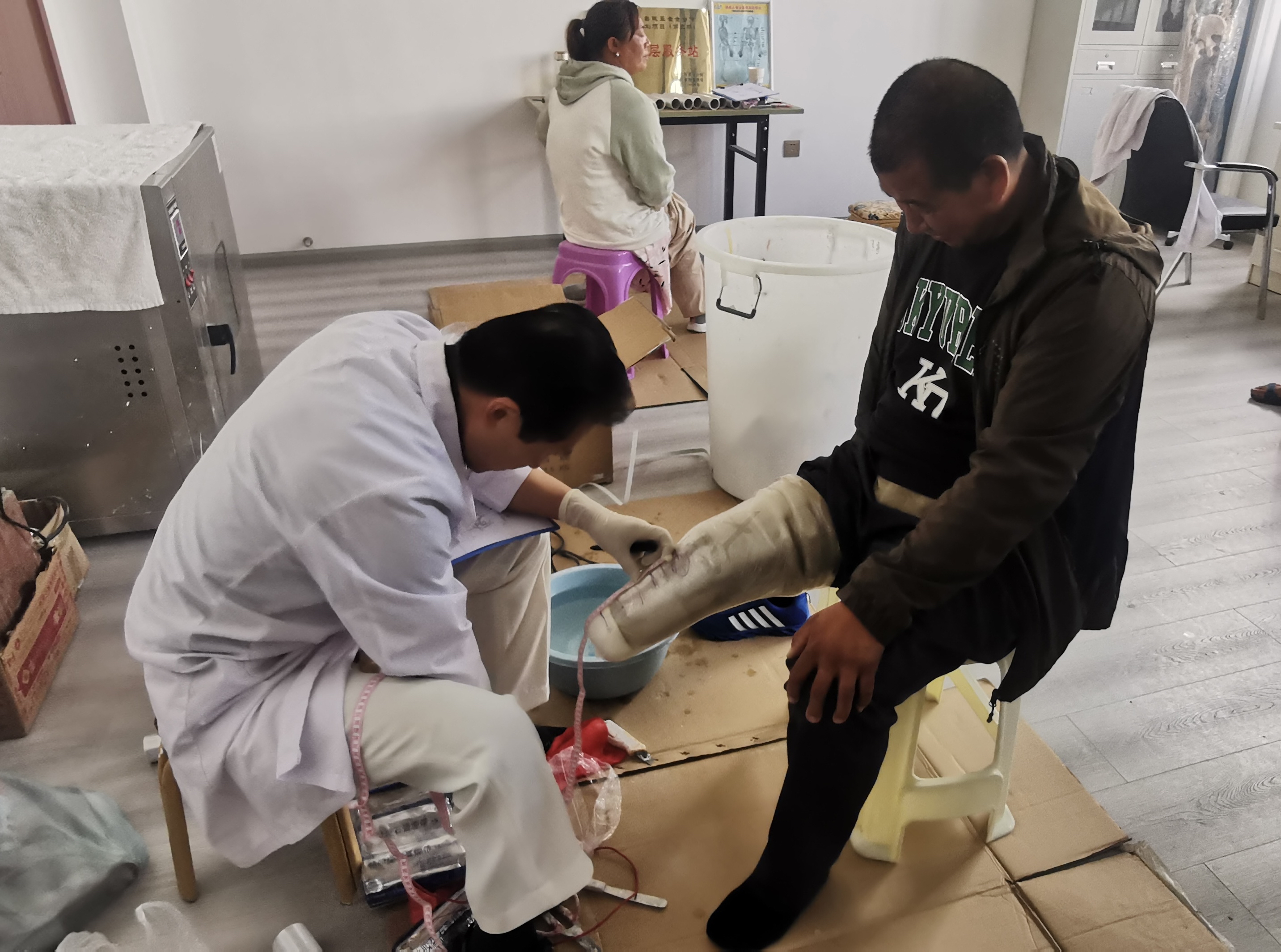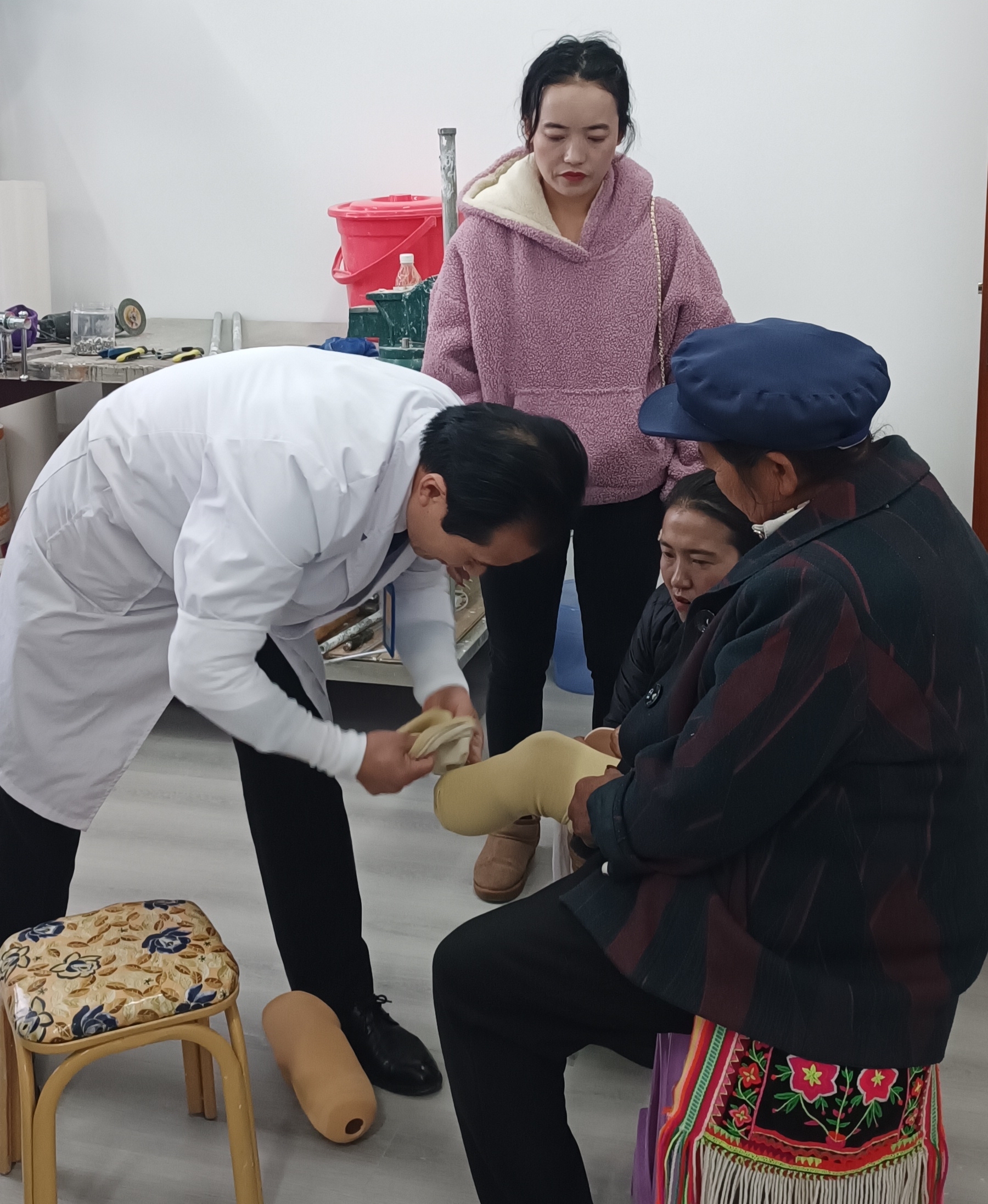近日,在州康復(fù)中心,隨著30名肢體殘障群體的假肢適配成功,2023年省級殘疾人事業(yè)彩票公益金助聽器、假肢適配服務(wù)項(xiàng)目圓滿結(jié)束。據(jù)了解,該項(xiàng)目在今年還為我州300名聽力殘障群體免費(fèi)適配助聽器。圖為醫(yī)生為肢體殘障人士適配假肢。