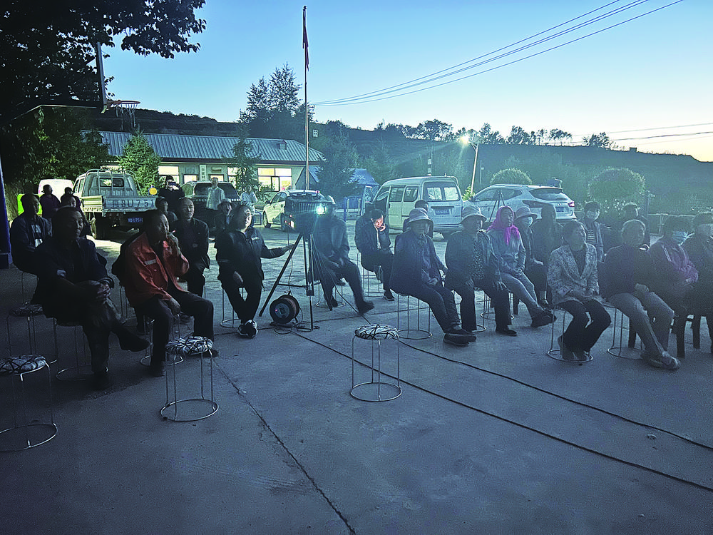 吳家洼村。光影下,村民們的目光齊齊聚集在正播放《長安三萬里》的熒幕上,黃得梅坐在設備旁和村民們一同觀看,時不時有幾個村民過來和她聊幾句。