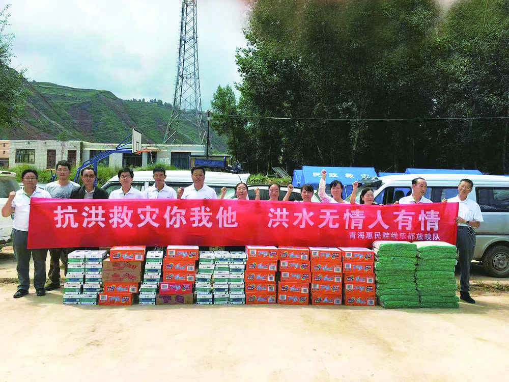 2022年,樂都區(qū)中壩藏族鄉(xiāng)發(fā)生洪災,黃得梅帶頭捐款,放映隊16名放映員買了一車方便面、牛奶、礦泉水和掛面送到了中壩。雖然洪水把很多路段都沖斷了,但是隊員們硬是用架子車把設備拉了上去,把溫暖和光影送給了受災群眾。