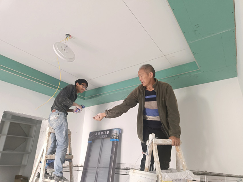 奎武村民李德華協(xié)助工人正在客廳忙著畫石膏線,得知記者來訪,李德華難掩激動(dòng),迫不及待地帶著記者參觀他的新家。