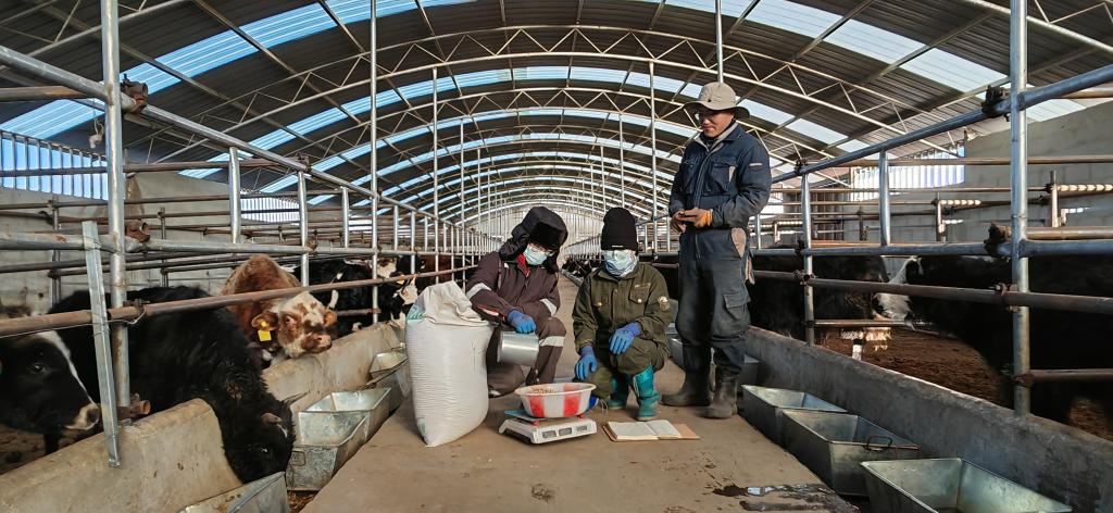 蘭州大學(xué)生態(tài)學(xué)院博士后景小平(右一)和團隊人員正在為牦牛配比飼料。新華社記者文靜 攝