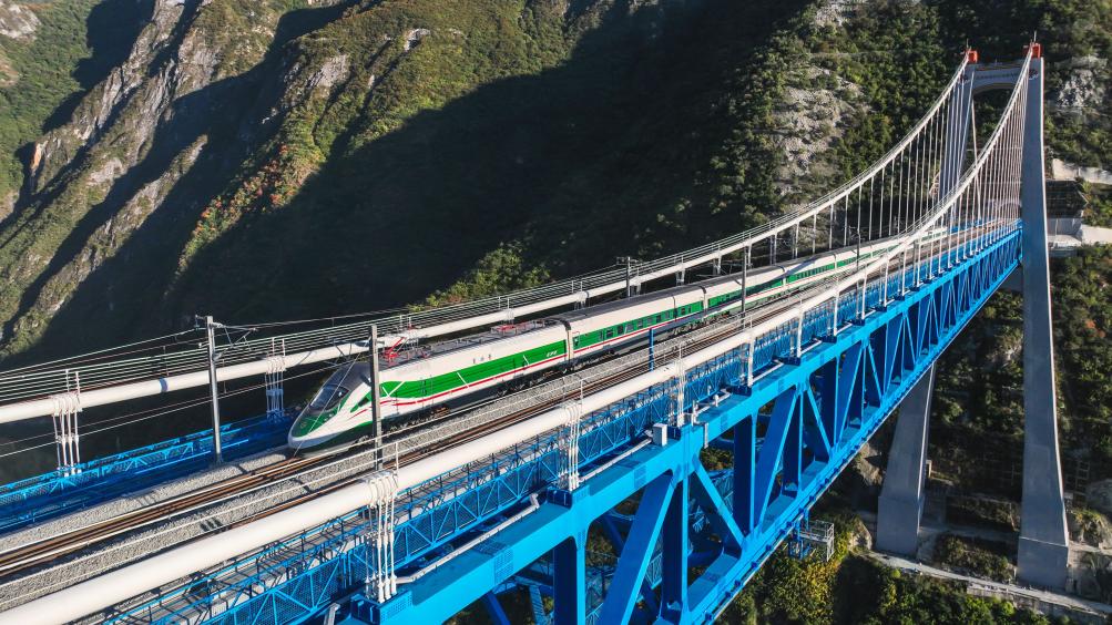 圖為11月9日,麗香鐵路動(dòng)態(tài)檢測(cè)期間,復(fù)興號(hào)列車駛過虎跳峽金沙江鐵路大橋。(中國(guó)鐵路昆明局集團(tuán)公司供圖)