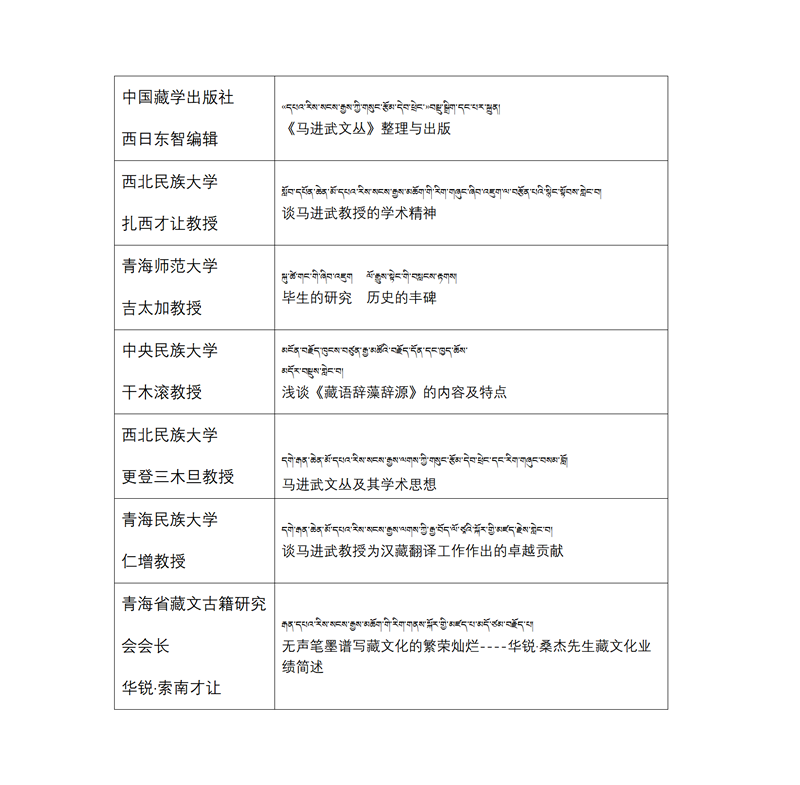 在學(xué)術(shù)交流會(huì)上,中國(guó)藏學(xué)出版社西日東智編輯、青海師范大學(xué)吉太加教授、西北民族大學(xué)扎西才讓教授、中央民族大學(xué)干木滾教授、西北民族大學(xué)更登三木旦教授、青海民族大學(xué)仁增教授、青海省藏文古籍研究會(huì)會(huì)長(zhǎng)華銳·索南才讓圍繞《馬進(jìn)武文叢》的整理與出版、《馬進(jìn)武文叢》的內(nèi)容特點(diǎn)與馬進(jìn)武教授的學(xué)術(shù)思想與學(xué)術(shù)貢獻(xiàn)等主題展開學(xué)術(shù)交流。