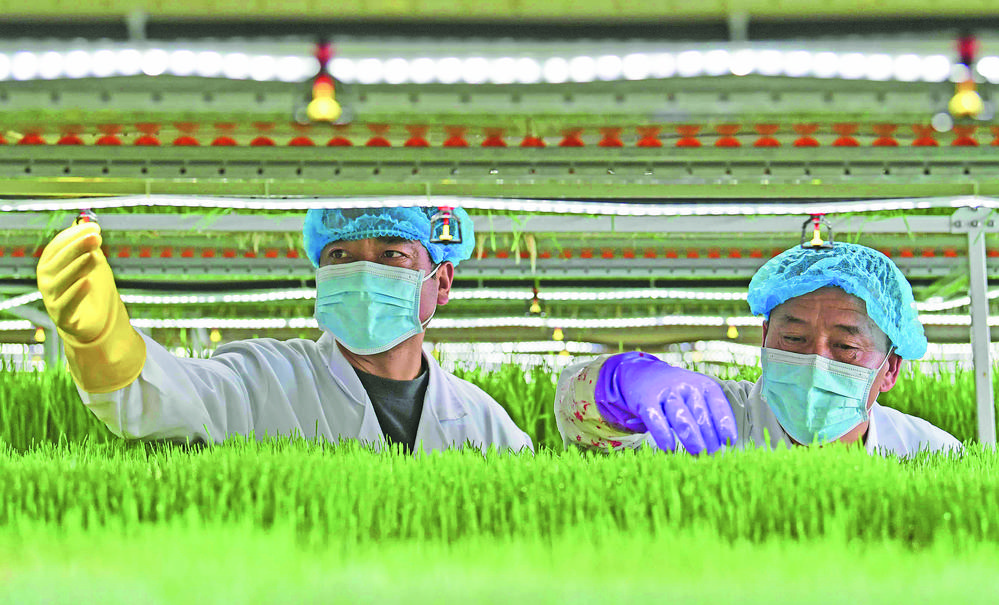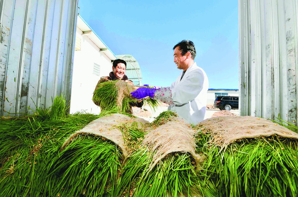 工作人員檢查牧草長(zhǎng)勢(shì)情況