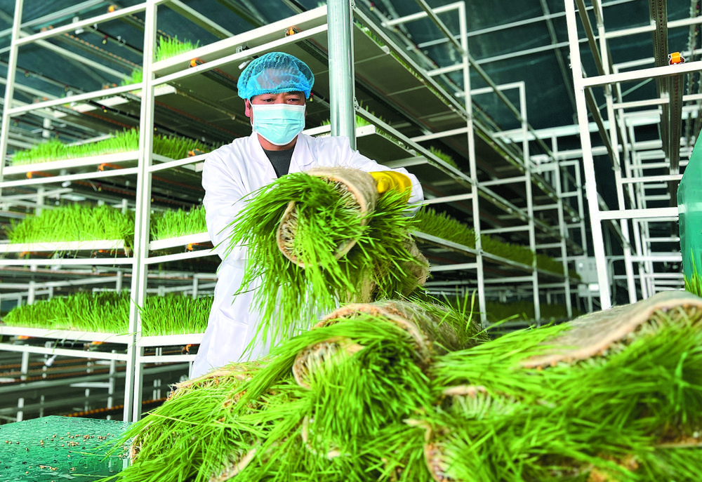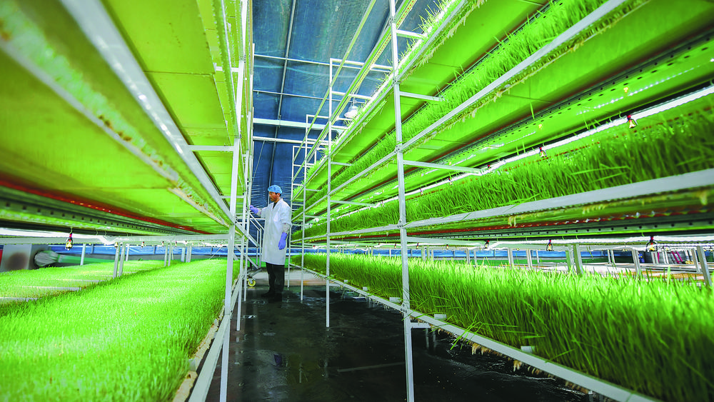 隨后,驅(qū)車(chē)來(lái)到位于海晏縣哈勒景蒙古族鄉(xiāng)哈勒景村的海北吉泰農(nóng)牧業(yè)科技有限公司,牧草無(wú)土栽培試點(diǎn)項(xiàng)目建設(shè)大棚中溫暖如春,兩排種植架整齊地豎立兩旁,架子上綠油油的青稞牧草長(zhǎng)勢(shì)喜人。據(jù)介紹,這些青稞牧草是無(wú)土栽培的,屬于芽苗類(lèi)草類(lèi),可連根帶葉一起喂食牛羊,其中的蛋白質(zhì)、維生素和淀粉含量較高,是名符其實(shí)的“營(yíng)養(yǎng)餐”。