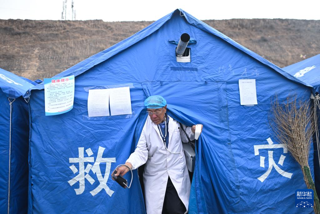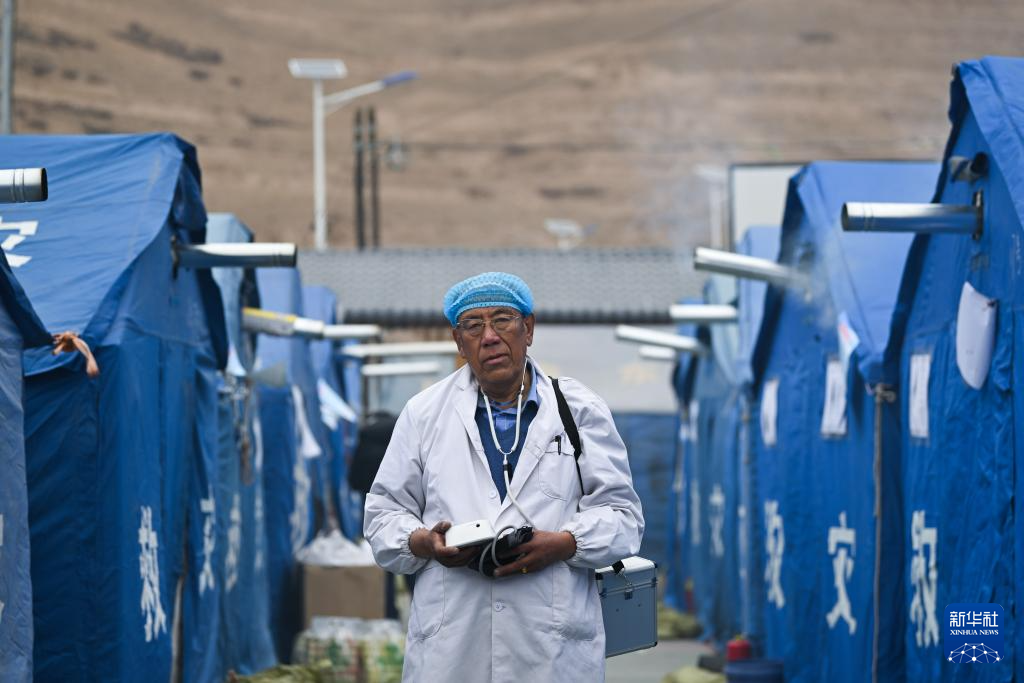 12月22日,完么仁增在牙木村安置點(diǎn)測量完群眾血壓后走出帳篷。新華社記者 張龍 攝