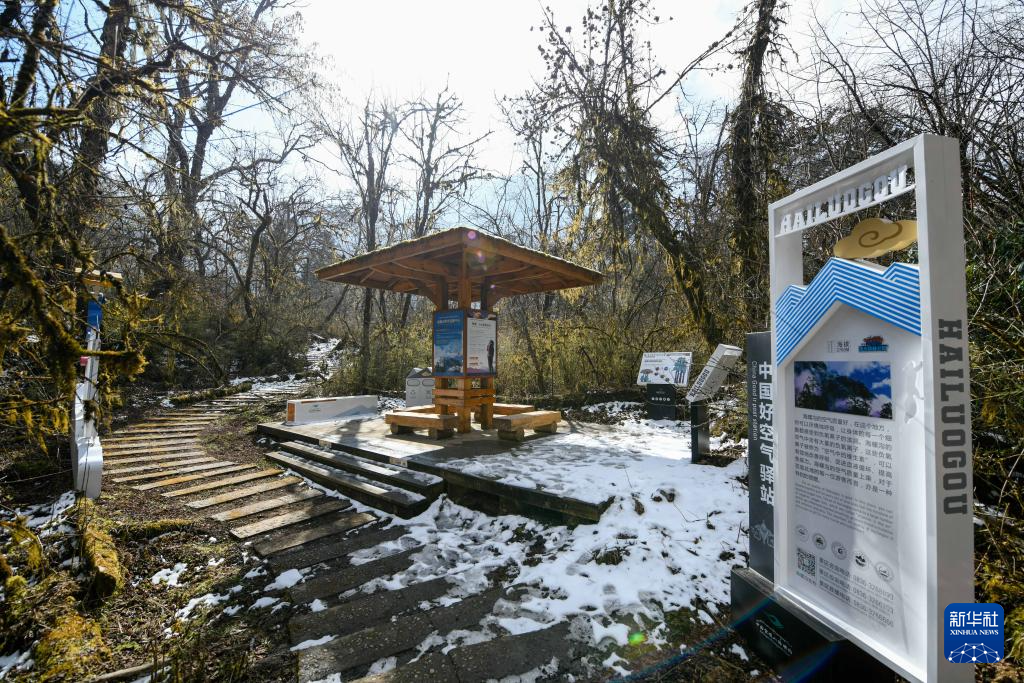 這是1月10日拍攝的海螺溝景區(qū)草海子步游道一角。景區(qū)重建時在步游道上新增了信息提示牌,供游客更好地認識海螺溝。新華社記者 胥冰潔 攝