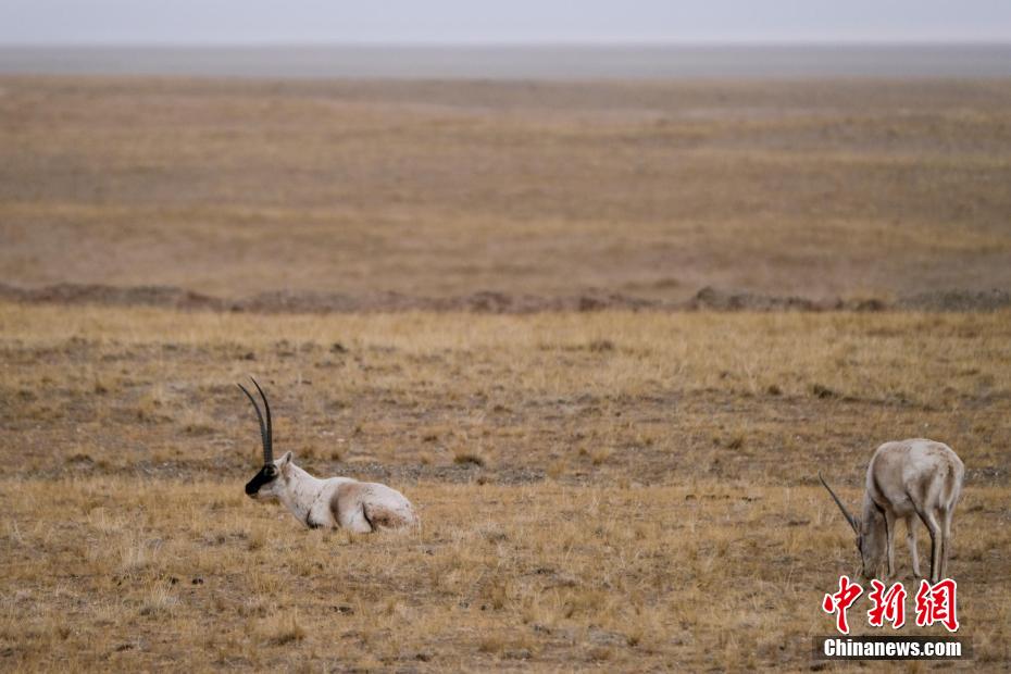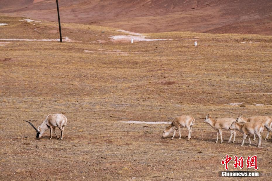青藏公路沿線藏羚羊等野生動物悠閑覓食