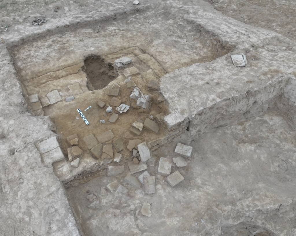 此外,考古隊員在最大的房址發(fā)現(xiàn)方形磚砌祭臺。專家表示,磚砌祭臺屬熱水墓群中的首次發(fā)現(xiàn),祭臺中發(fā)現(xiàn)大量磚塊。通過陵園及祭祀建筑的規(guī)模、數(shù)量等線索推測,這個墓葬的規(guī)格、墓主人的身份等級要高于2018血渭一號墓。