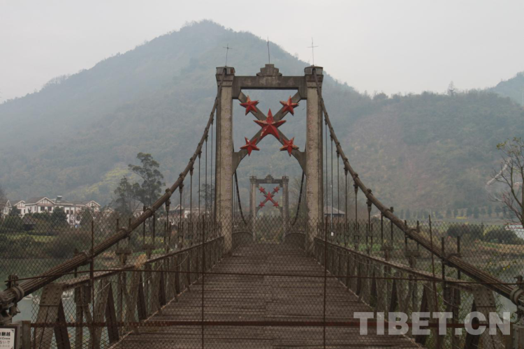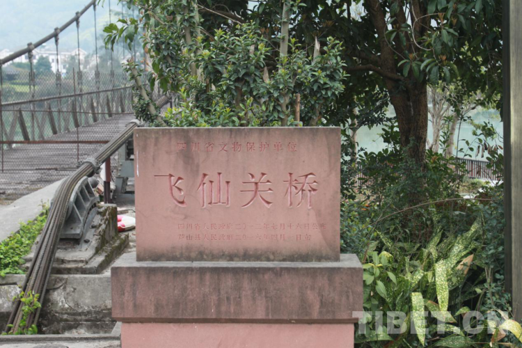站在橋邊,遙望蜿蜒的江水就是青衣江,飛仙關(guān)橋全長(zhǎng)164米,寬4.5米,索塔為鋼筋混凝土門式框架,高29米,流動(dòng)式索鞍,策略式索錠,當(dāng)時(shí)的設(shè)計(jì)載重為15噸。橋柱橫額上有時(shí)任西南軍政委員會(huì)主席劉伯承所題寫的橋名——“飛仙關(guān)橋”。橋西岸塔柱有時(shí)任十八軍政委譚冠三題寫的檻聯(lián)——“發(fā)揮天才,發(fā)揮力量,戰(zhàn)勝困難,創(chuàng)造人民幸福,一面進(jìn)軍,一面建設(shè)解放西藏,鞏固西南國(guó)防”的字樣。東岸塔柱上有時(shí)任西康省主席廖志高題寫的檻聯(lián)——“勞動(dòng)創(chuàng)造世界飛仙天險(xiǎn)何難克服,革命帶來(lái)幸福閉塞邊區(qū)從此繁榮”字樣。橋上五顆閃閃的紅星,映照著飛仙關(guān)的繁榮,也印證著革命前輩們的美好愿景已經(jīng)變?yōu)楝F(xiàn)實(shí)。