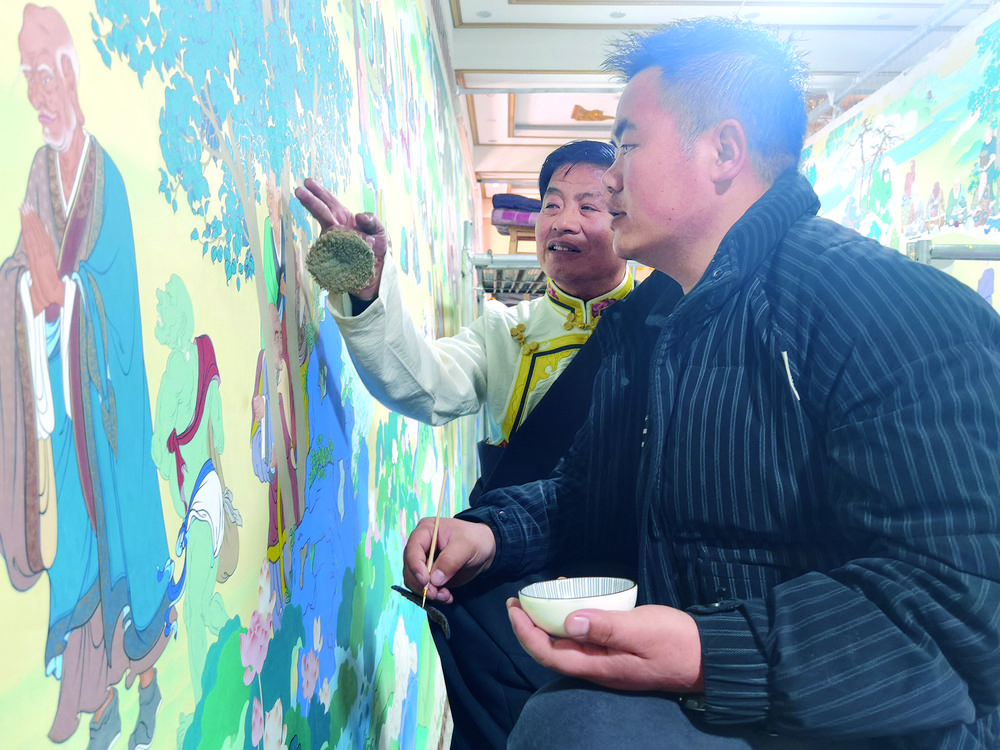 “小范,朱砂顏色有點厚,碗里再加點水,顏料稠度要合適,這樣顏料不易從畫布上剝落……”扎西尖措耐心地指導徒弟范慶基。每天,扎西尖措都會來畫室轉轉,為徒弟指出繪畫、上色等方面的不足之處,幫助他們更快進步。