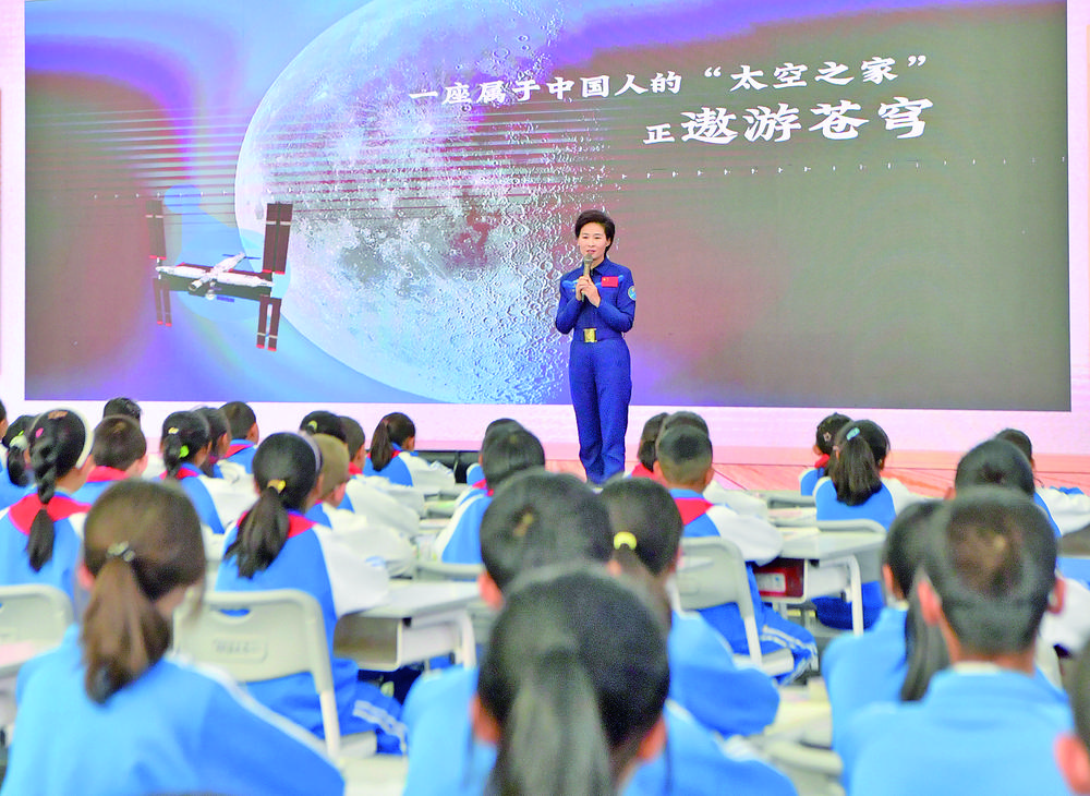 中國(guó)首位女航天員劉洋正在為同學(xué)們授課。王偉才 李娜 攝