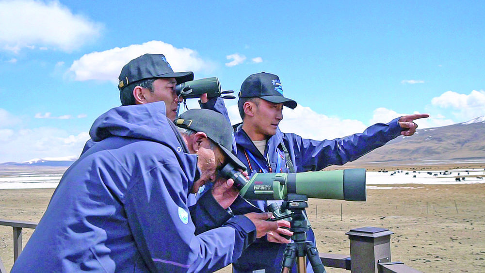 巴桑才仁(中)與管護(hù)員觀測(cè)鳥(niǎo)類。張得俊 攝