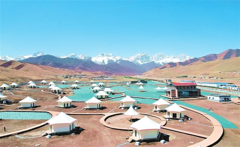 藍天白云、雪山皚皚,俯瞰天祝縣抓喜秀龍旅游基礎(chǔ)設(shè)施建設(shè)項目現(xiàn)場,蜿蜒曲折的木棧道如花莖延伸,一座座白頂帳篷外形的民宿似雪蓮綻放,幾十名工人爭分奪秒搶抓工期,為項目完工做最后沖刺。