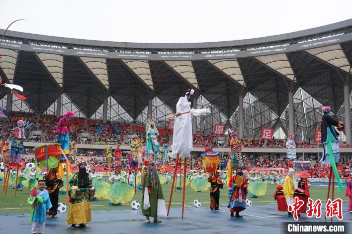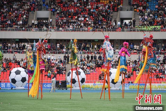 圖為開幕式現(xiàn)場社火高蹺進行表演。馬銘言 攝