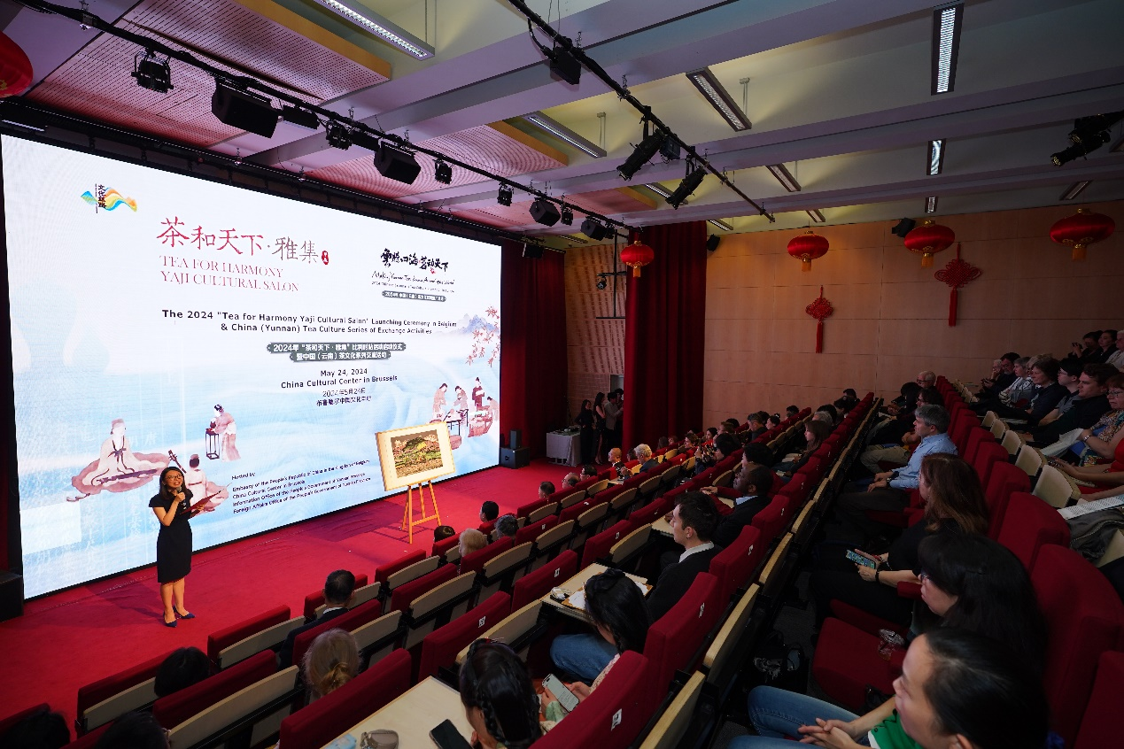 這幅作品由中國著名藝術(shù)家賀昆創(chuàng)作,通過木板套刻和層層渲染,鐫刻了全球首個茶主題世界文化遺產(chǎn)“普洱景邁山古茶林文化景觀”人、茶、林共生的美好畫面。當(dāng)?shù)貢r間5月24日,在布魯塞爾中國文化中心舉辦的“茶和天下·雅集”比利時站活動啟動儀式暨中國(云南)茶文化系列交流活動上,現(xiàn)場揭幕了這幅來自云南的作品。