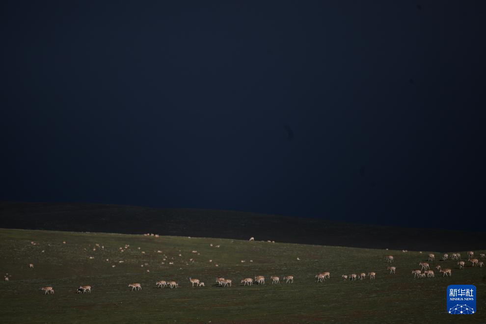 7月8日,在可可西里卓乃湖區(qū)域,幾只藏羚羊在活動。新華社 杜笑微 攝