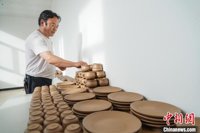 7月18日,在班瑪黑陶培訓及體驗中心,非遺傳承人謝格太正在清點陶坯數(shù)量。中新社記者 馬銘言 攝
