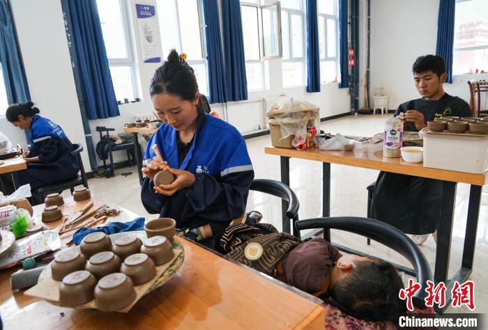 7月18日,已在班瑪黑陶培訓及體驗中心工作5年的27歲藏族女子措毛吉(中)正在制作班瑪黑陶,孩子在她身邊熟睡。中新社記者 馬銘言 攝