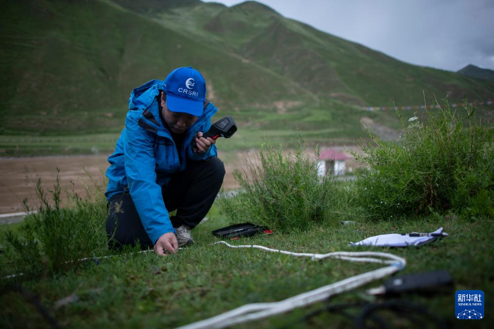 7月20日,在直門達(dá)水文站,長江科學(xué)院水土保持研究所任斐鵬在進(jìn)行植被生態(tài)和水土流失調(diào)查。新華社記者 伍志尊 攝