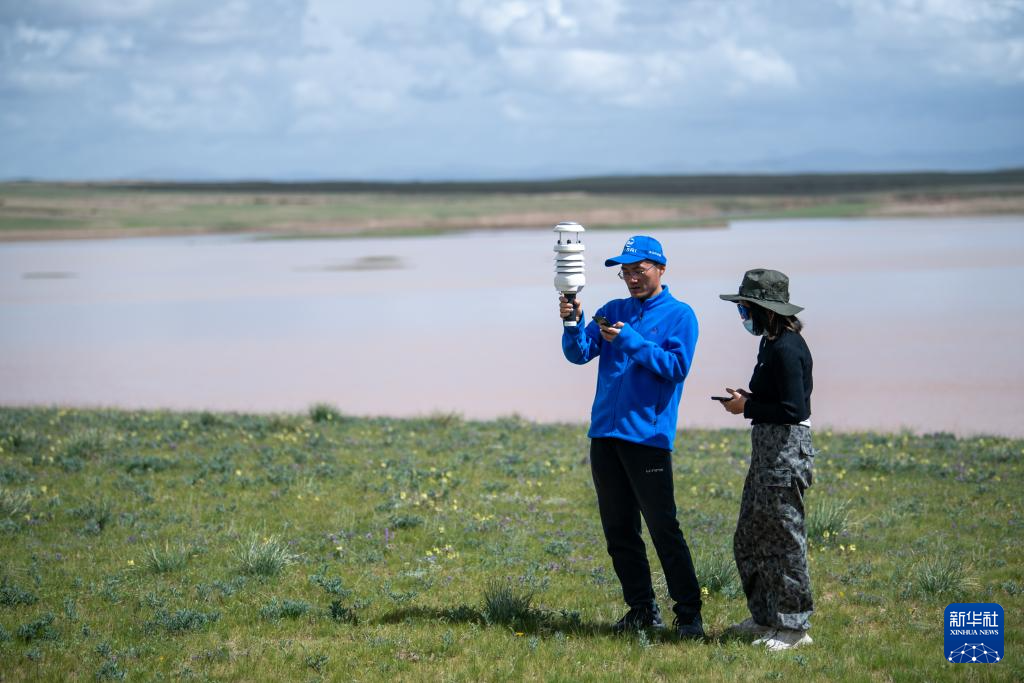 7月22日,在查旦濕地,科考隊員查看植被情況。新華社發(fā) 杜笑微 攝