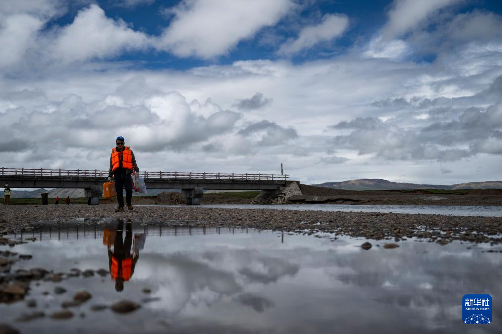 7月24日,在沱沱河唐古拉山鎮(zhèn)段,科考隊員在測量現(xiàn)場氣象條件。新華社記者 伍志尊 攝