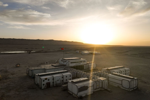 汽車沿“火星一號”公路顛簸前行近百公里,一片由白色集裝箱拼裝而成的營地出現(xiàn)在眼前。這是一個集科學(xué)探索、旅游觀光、戶外探險于一體的綜合性營地,走進(jìn)夢幻般的甬道,太空艙像蜂巢一般立在眼前,仿佛置身于另一個世界。