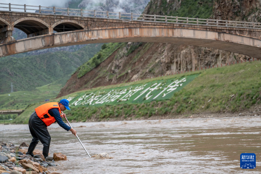 7月21日,在囊謙香達(dá)河段,科考隊(duì)員在進(jìn)行底棲生物監(jiān)測(cè)采樣。新華社記者 伍志尊 攝
