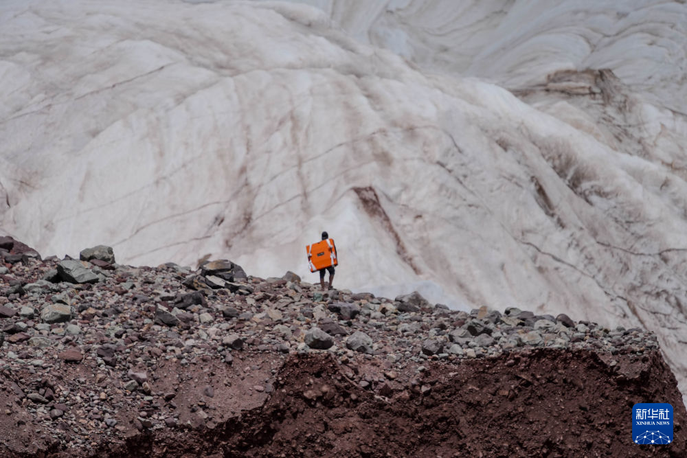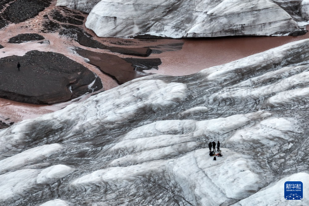 7月25日,在冬克瑪?shù)妆?,科考?duì)員在探測(cè)冰川(無人機(jī)照片)。新華社記者 伍志尊 攝