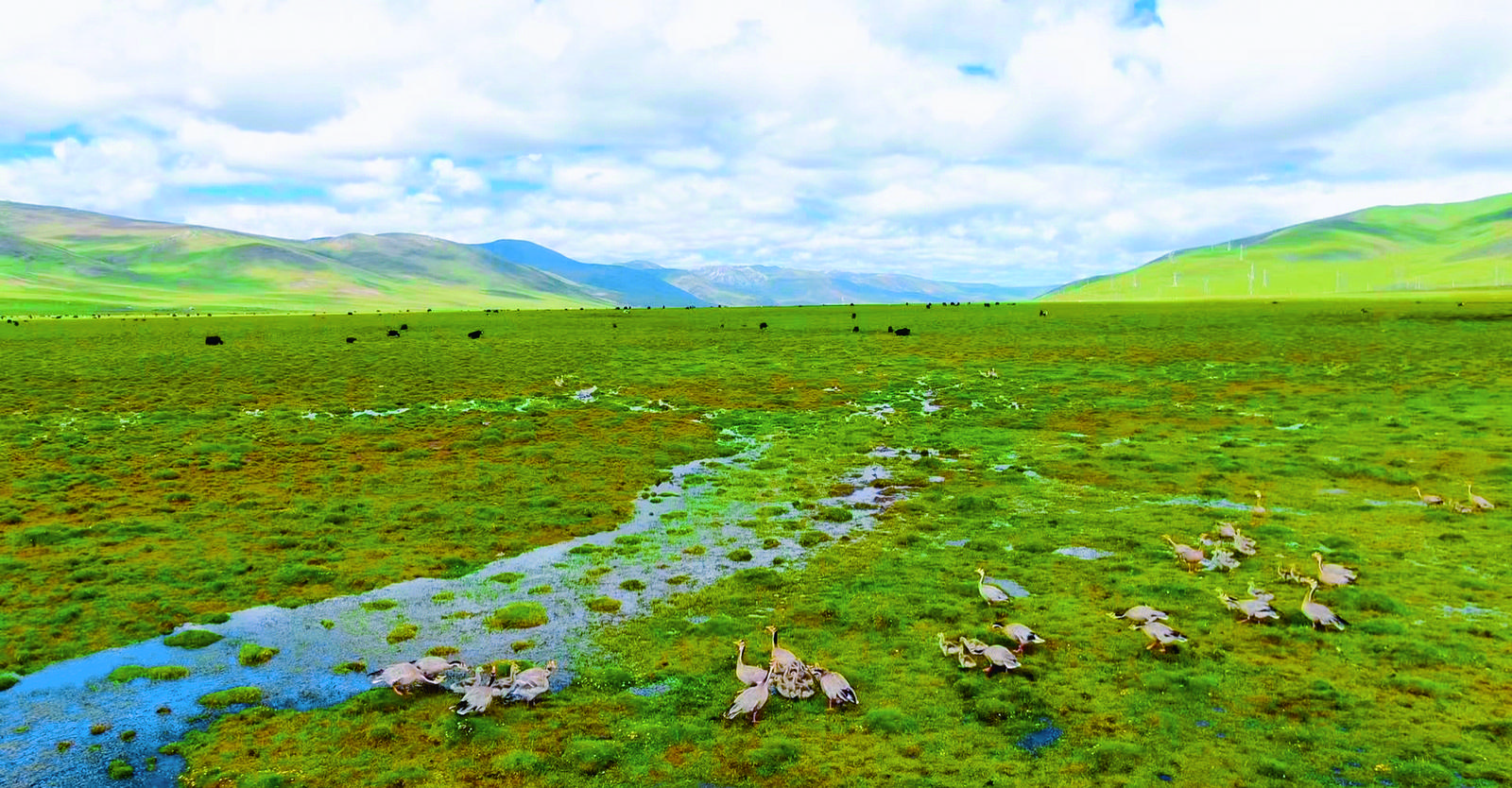 在市區(qū)西南八十多公里外,來(lái)到玉樹(shù)州玉樹(shù)市隆寶鎮(zhèn)境內(nèi)的青海隆寶灘國(guó)際重要濕地,一樣綠意滿溢。近處,牧草尖尖掛著水珠;遠(yuǎn)處,鳥(niǎo)兒踩著水草,泛起點(diǎn)點(diǎn)漣漪。