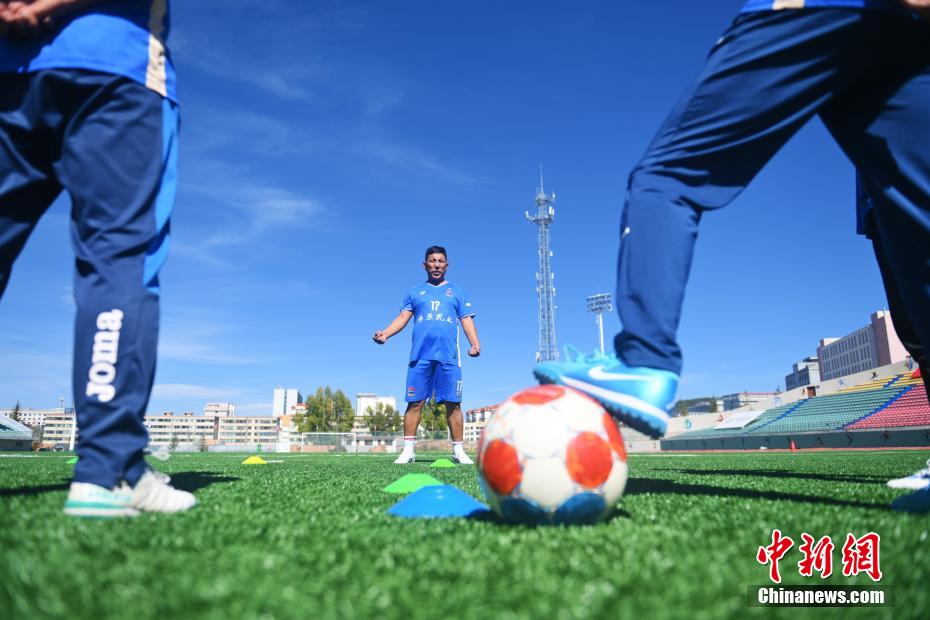 10月15日,在甘肅省甘南藏族自治州合作市一足球場(chǎng)內(nèi),甘南九二聯(lián)隊(duì)隊(duì)長(zhǎng)久西道杰進(jìn)行帶球培訓(xùn)。為了比賽經(jīng)費(fèi),今年38歲的久西道杰作為隊(duì)長(zhǎng)帶領(lǐng)球隊(duì)多次登門拜訪各單位與企業(yè),并且嘗試“自我造血”開(kāi)啟直播帶貨賣球衣、球鞋等體育用品來(lái)籌集經(jīng)費(fèi)。