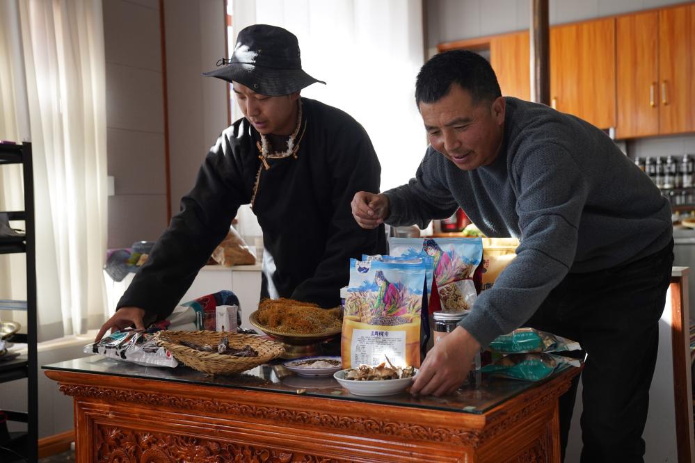 在四川省甘孜藏族自治州理塘縣甲洼鎮(zhèn),達洼(左)和爸爸為當(dāng)天的直播做準(zhǔn)備(11月3日攝)。