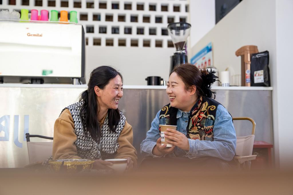 在四川省甘孜藏族自治州巴塘縣,劉莎莎在巴塘縣社會力量發(fā)展中心集群與咖啡廳的負責(zé)人格秋曲珍聊天(11月5日攝)。