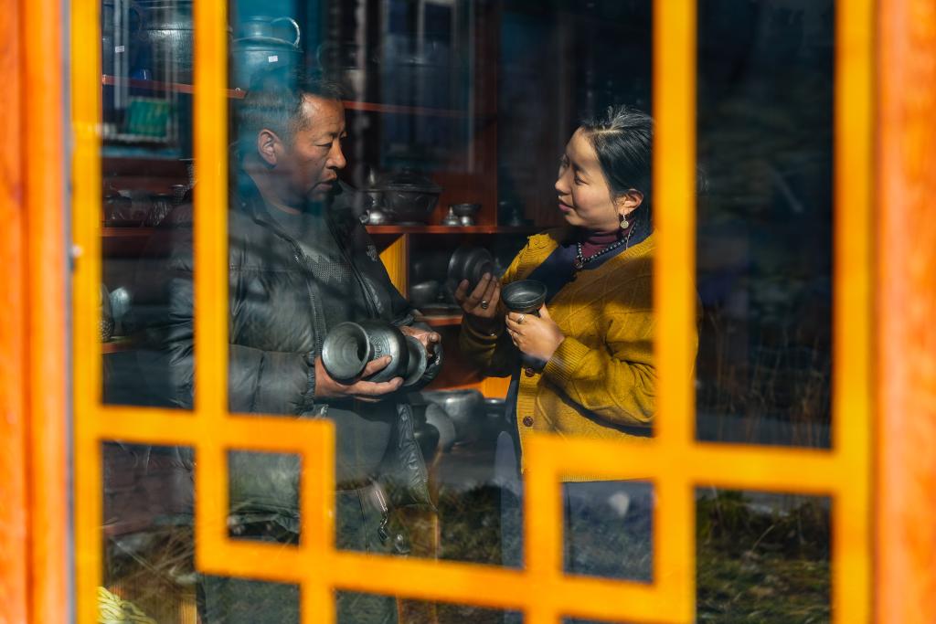 在德格縣麥宿鎮(zhèn)的扎堪倉黑陶工坊,達瓦卓瑪(右)向工坊主理人降擁格乃了解工坊近期的經(jīng)營情況以及新品研制進展(11月4日攝)。達瓦卓瑪經(jīng)常會與麥宿鎮(zhèn)的其他手工藝者交流經(jīng)營中遇到的問題,想辦法幫他們解決。