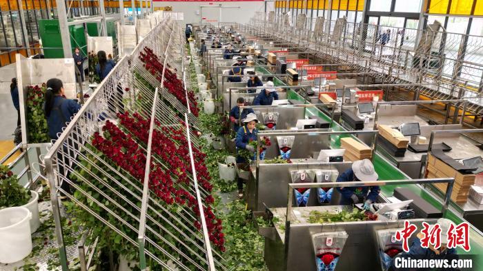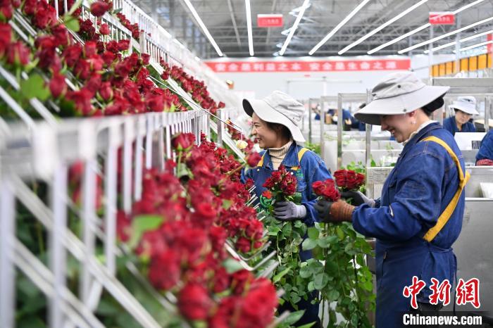 甘肅臨夏回族自治州臨夏市23日寒風(fēng)正勁。步入該市枹罕鎮(zhèn)青寺村的百益億農(nóng)國(guó)際鮮花港內(nèi),暖意正濃。引自荷蘭的多個(gè)品種玫瑰花競(jìng)相開放,它們即將被打包發(fā)往北京、上海、廣州,以及東南亞等地。