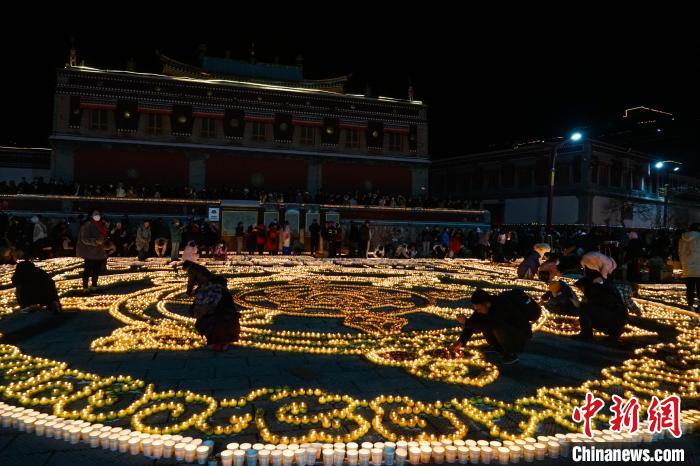 傍晚六時(shí)許,在塔爾寺標(biāo)志性建筑八寶如意塔周?chē)?,僧眾在擺成各種圖案、藏漢字符的燈陣中小心翼翼穿行,用紙板圍擋住搖曳火光,蹲在地上一遍遍重新燃起被風(fēng)吹熄的點(diǎn)點(diǎn)火苗,口中默誦經(jīng)文,不少人環(huán)顧四周,高舉手機(jī),記錄殊勝時(shí)刻。