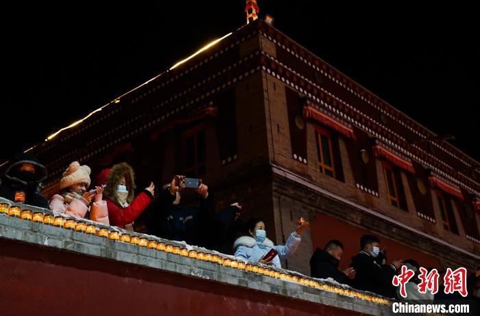 天黑后,寺院內(nèi)法號(hào)低回,路兩旁、院墻上、殿堂外,均燃起酥油燈盞。不遠(yuǎn)處?kù)猩t煙火繚繞,與人們呼出的氤氳白氣一起消散在空中。