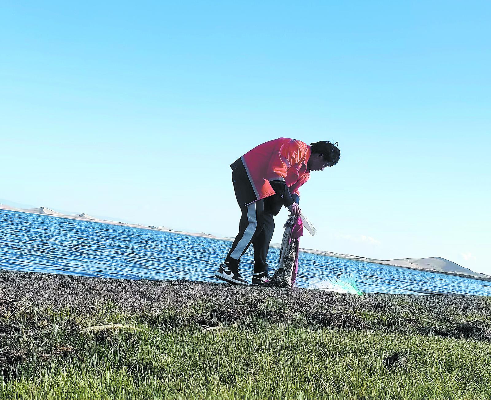甘子河鄉(xiāng)熱水村生態(tài)員桑日杰東智布,剛參加完村里的會議,就往他負(fù)責(zé)的巡護(hù)區(qū)域走去。他的區(qū)域靠近青海湖邊,他邊走邊拿著袋子將見到的垃圾撿起,等返回來的時候再撿一遍。