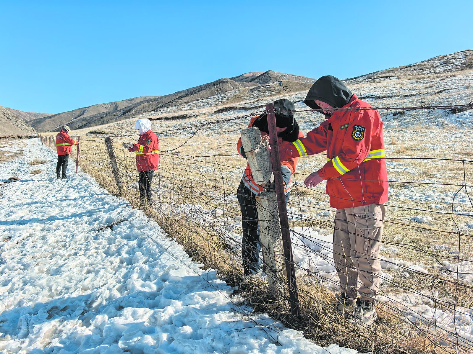 生態(tài)管護(hù)員在維修網(wǎng)圍欄。丁玉梅 攝