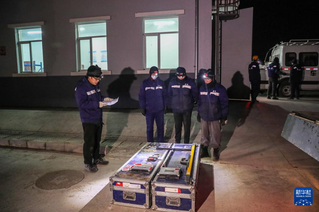 1月13日晚,在天祝西高鐵綜合維修基地,線路工正在清點工具材料。新華社記者 郎兵兵 攝