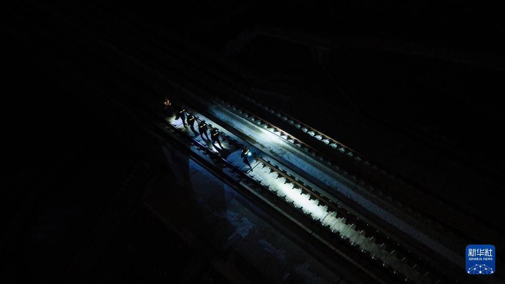 1月14日凌晨,橋隧工和線路工在新烏鞘嶺隧道內(nèi)開展檢查作業(yè)(無人機照片)。新華社記者 郎兵兵 攝